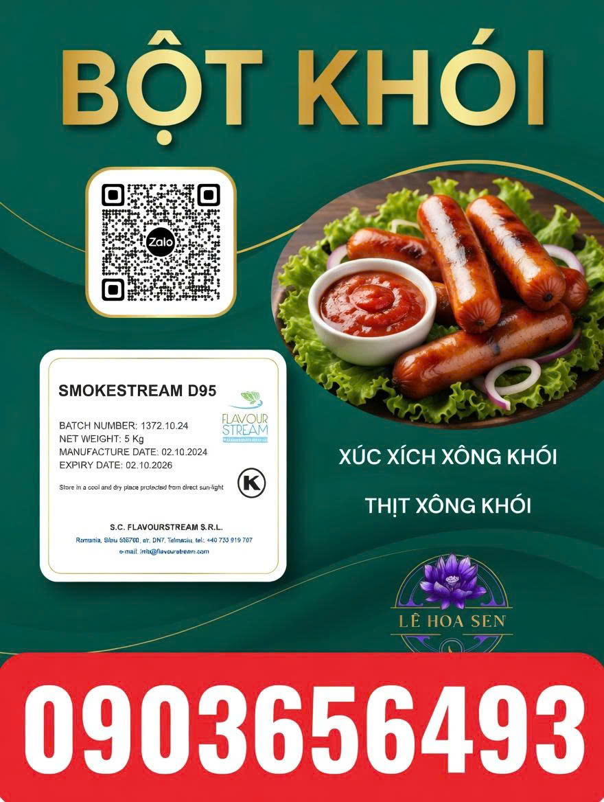 BỘT KHÓI thực phẩm, Hương xông khói thực phẩm, BỘT khói Sản phẩm phù hợp: Dùng trong sản xuất mì ăn liền, xúc xích, thịt gác bếp, lạp xưởng, thịt xông khói, gia vị tẩm ướp và nhiều sản phẩm chế biến từ thịt, cá khác…Làm tăng hương xông khói đặc trưng cho các món như xúc xích xông khói, jambon, thịt hun khói, chân giò muối, snack