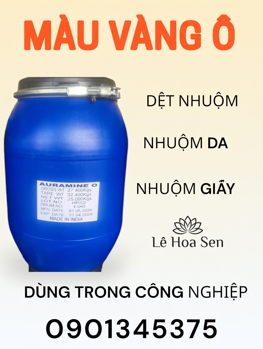 Tên gọi Quốc tế: Auramine O Công thức hóa học: C17H22ClN3 Hàm lượng: 100% Các ứng dụng của Auramine O: – Auramine O (còn gọi là Vàng O, vàng ô) là một loại thuốc nhuộm diarylmetan được dùng để nhuộm huỳnh quang trong sinh học. Ở dạng tinh khiết, tinh thể Auramine O có hình kim màu vàng. Nó rất dễ tan trong nước và có thể tan trong ethanol. – Auramine O có thể được dùng để nhuộm các loại vi khuẩn kháng toan (vd Mycobacterium, trong đó nó kết hợp với axit mycolic ở vỏ tế bào) tương tự như kỹ thuật nhuộm Ziehl-Neelsen. Nó cũng được dùng như một dạng huỳnh quang của thuốc thử Schiff. – Auramine O có thể được dùng kèm với Rhodamine B để tạo thành thuốc nhuộm auramine-rhodamine (AR) cho vi khuẩn lao. Nó cũng được dùng như một chất khử trùng. Auramine O có thể được sử dụng trong nhuộm các sợi acrylic, sợi tơ và sợi bông; cũng được sử dụng trong nhuộm da, giấy, gai dầu và viscose; Auramine O cũng có thể được sử dụng trong việc in trực tiếp và in ra giấy bẩn của bông nhuộm tannin, và cũng được sử dụng để sản xuất hồ màu và được sử dụng trong mực.